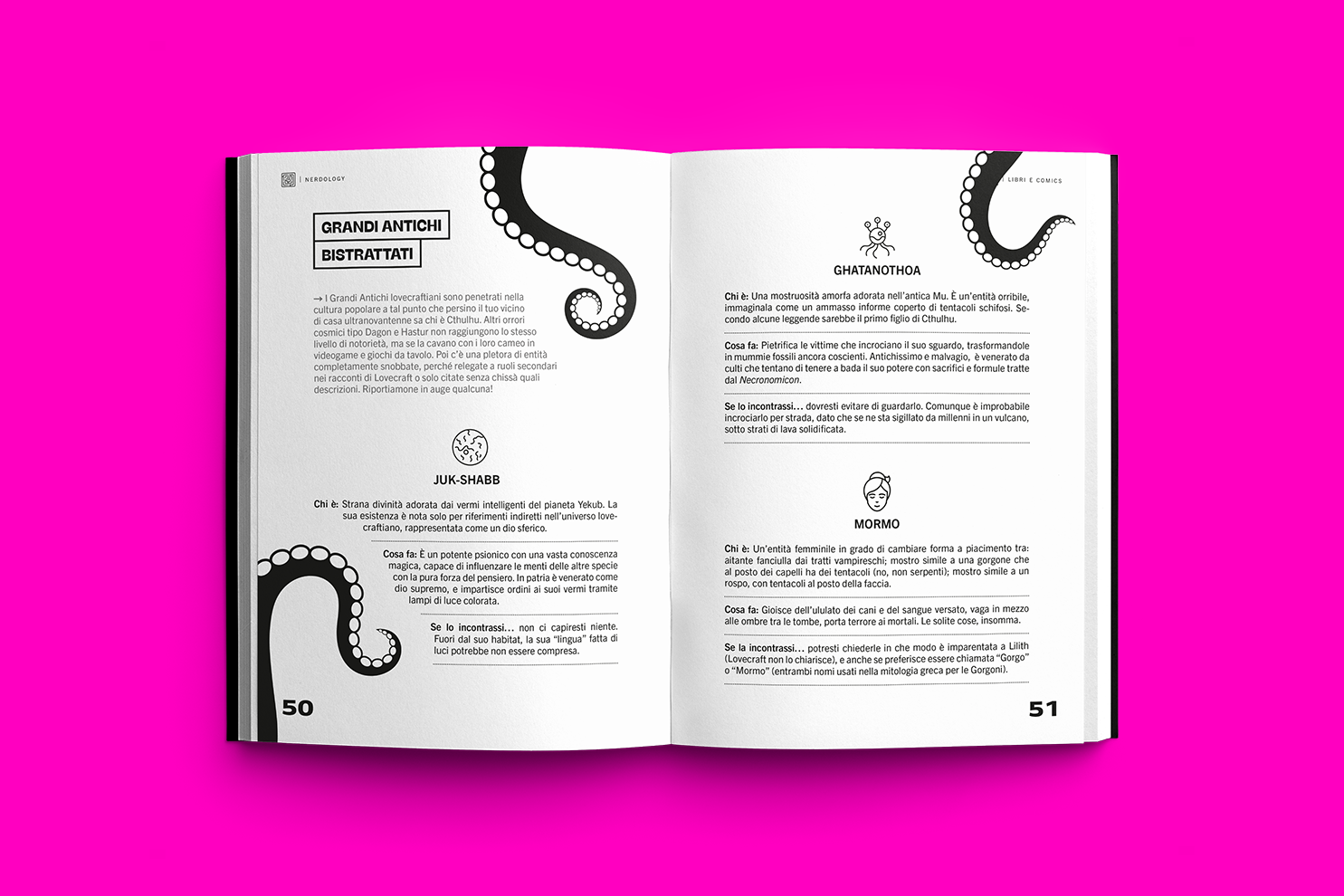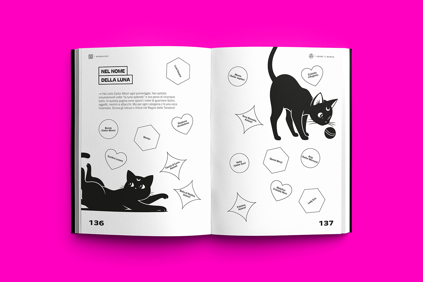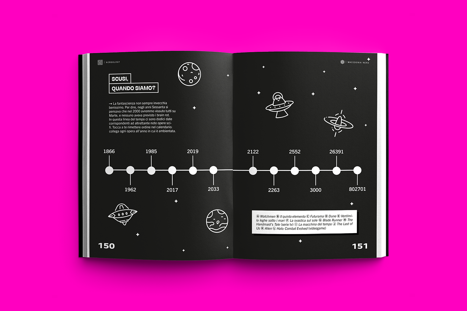 Videogames, serie TV, comics, giochi da tavolo, anime, manga: un libro di quiz, giochi, curiosità e rompicapi per veri nerd. Concept di Gianluca Bavagnoli e Laura Cantarelli, testi di Carlo Resca, progetto grafico e illustrazioni di Luca Dentale.